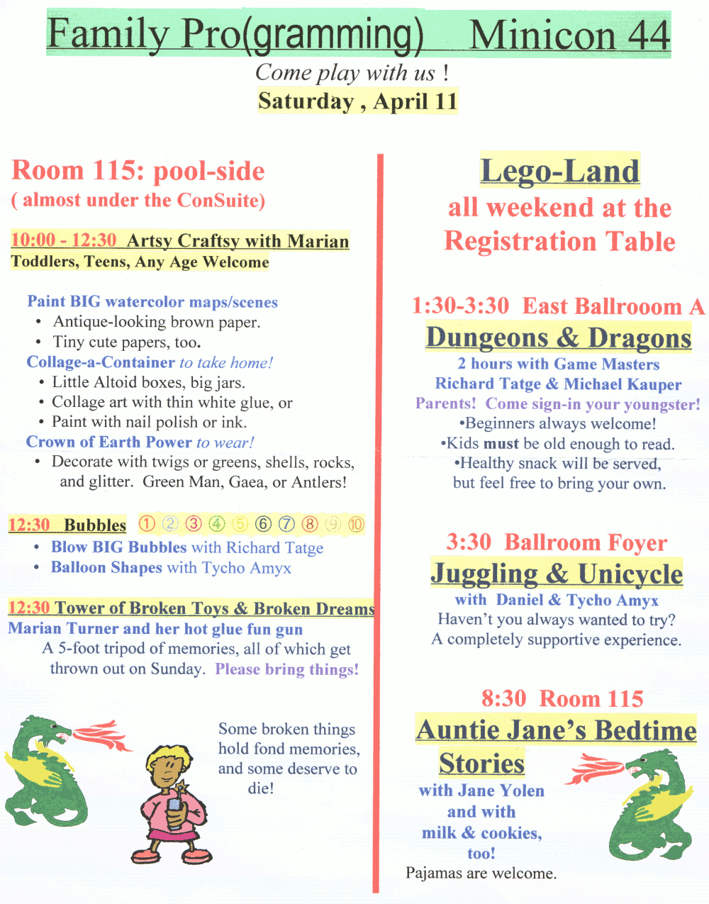 Minicon features several hours of special Kids' Programming on Saturday. Kids of all ages will have an opportunity to hot glue a really tall pile of junk, and also take techie stuff apart. Comics, food, music, art (and more?). Best of all, Richard Tatge's amazing bubble show.